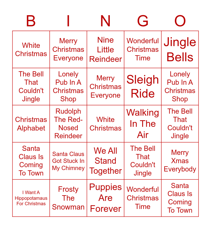 ⚠ This card has duplicate items: Walking In The Air (4), Jingle Bells (4), The Bell That Couldn't Jingle (4), Step Into Christmas (4), Here Comes Santa Claus (4), Rudolph The Red-Nosed Reindeer (4), White Christmas (4), Puppies Are Forever (4), Keeping The Dream Alive (4), We All Stand Together (4), Wonderful Christmas Time (4), Merry Christmas Everyone (4), Merry Xmas Everybody (4), Frosty The Snowman (4), Christmas Time (4), Santa Claus Is Coming To Town (4), Sleigh Ride (4), The Twelve Days Of Christmas (4), Christmas Alphabet (4), I Want A Hippopotamaus For Christmas (4), Lonely Pub In A Christmas Shop (4), Nine Little Reindeer (4), Santa Claus Got Stuck In My Chimney (4), Winter Wonderland (4), I Wish It Could Be Christmas Everyday (4)