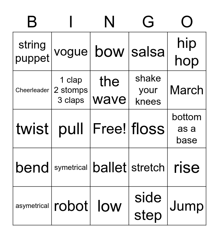 This bingo card has a free space and 43 words: Twirl, Jump, Kick, asymetrical, spin, side step, bow, moonwalk, hip hop, robot, salsa, floss, ballet, symetrical, high, low, shake, twist, freestyle, March, vogue, macarena, Cha cha slide, string puppet, knees as a base, bottom as a base, spirit fingers, create a shape, stretch, bend, sink, rise, sway, pull, push, head and shoulders knees and toes, raise the roof, the wave, Cheerleader, shake your knees, Clap to Mary had a little lamb, 1 clap 2 stomps 3 claps and melting.