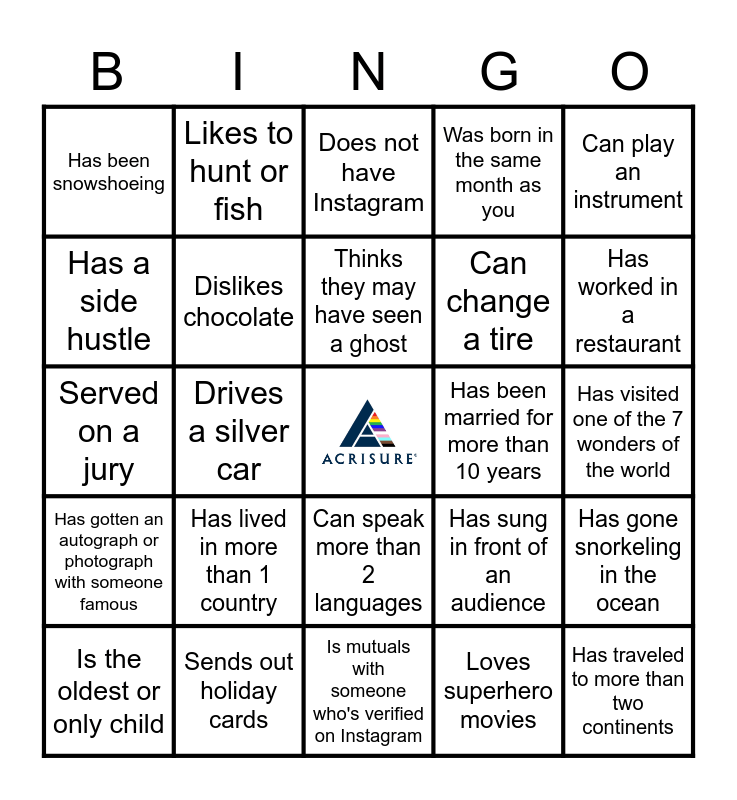 This bingo card has a free space and 44 words: Has 1000+ followers on a social media account, Has traveled to more than two continents, Has been on a tv show or in a movie, Is the oldest or only child, Has more than 5 tattoos, Loves superhero movies, Does not have Instagram, Sets more than 1 morning alarm on their phone, Can play an instrument, Sends out holiday cards, Was born in the same month as you, Has been married for more than 10 years, Can speak more than 2 languages, Has lived in more than 1 country, Played a sport in high school, Is mutuals with someone who's verified on Instagram, Is done with their holiday shopping, Served on a jury, Has broken a bone, Has worked in a restaurant, Likes to hunt or fish, Has run a marathon, Is left handed, Has been snowshoeing, Had a post on social media go viral, Has visited one of the 7 wonders of the world, Has read "Frankenstein" by Mary Shelley, Knows how to play chess, Has sung in front of an audience, Has gotten an autograph or photograph with someone famous, Typically skips breakfast, Has gone snorkeling in the ocean, Identifies as a morning person, Has gotten stuck in an elevator, Drives a silver car, Owns an adult coloring book, Goes by a nickname, Has a pet other than a dog or cat, Thinks they may have seen a ghost, Has a side hustle, Can change a tire, Has worked at Acrisure for 5+ years, Dislikes chocolate and Owns 5+ houseplants.