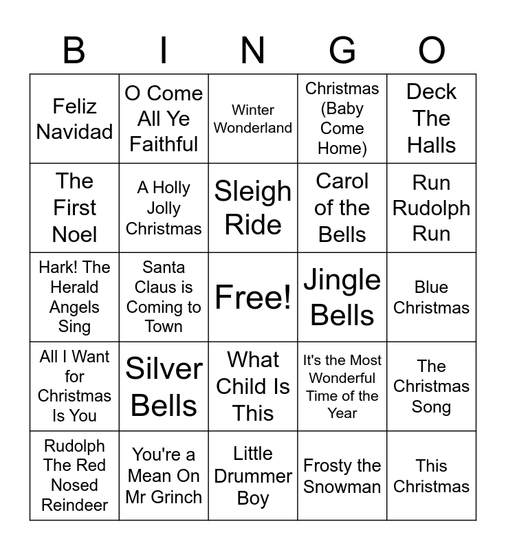 This bingo card has a free space and 36 words: Jingle Bell Rock, Rockin' Around the Christmas Tree, Let It Snow! Let It Snow! Let it Snow!, A Holly Jolly Christmas, It's the Most Wonderful Time of the Year, All I Want for Christmas Is You, Sleigh Ride, It's Beginning to Look a Lot Like Christmas, Deck The Halls, Last Christmas, Santa Claus is Coming to Town, Christmas (Baby Come Home), Little Saint Nick, Jingle Bells, Run Rudolph Run, Feliz Navidad, Up on the Housetop, Silver Bells, This Christmas, Winter Wonderland, Blue Christmas, The Christmas Song, You're a Mean On Mr Grinch, Rudolph The Red Nosed Reindeer, Little Drummer Boy, O Come All Ye Faithful, Hark! The Herald Angels Sing, Silent Night, Carol of the Bells, The First Noel, I'll Be Home for Christmas, Ave Maria, Frosty the Snowman, What Child Is This, It Came Upon A Midnight Clear and O Holy Night.