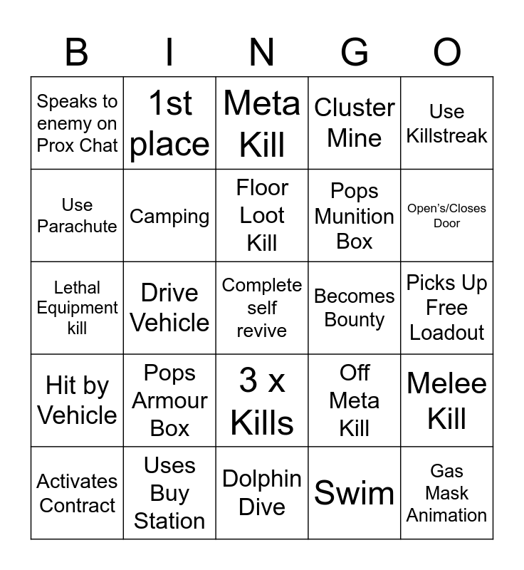 This bingo card has 25 words: Pops Armour Box, Dolphin Dive, Floor Loot Kill, Activates Contract, Use Killstreak, Speaks to enemy on Prox Chat, Use Parachute, 1st place, Becomes Bounty, 3 x Kills, Pops Munition Box, Lethal Equipment kill, Off Meta Kill, Melee Kill, Camping, Gas Mask Animation, Picks Up Free Loadout, Meta Kill, Open’s/Closes Door, Drive Vehicle, Complete self revive, Uses Buy Station, Hit by Vehicle, Cluster Mine and Swim.