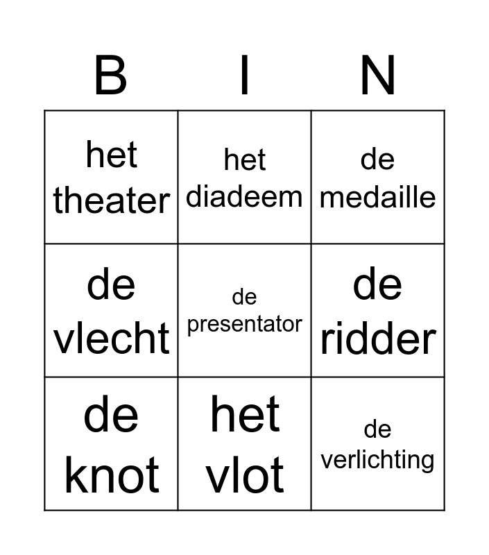 This bingo card has a free space and 8 words: de ridder, de medaille, het diadeem, de knot, het theater, de verlichting, de vlecht and het vlot.