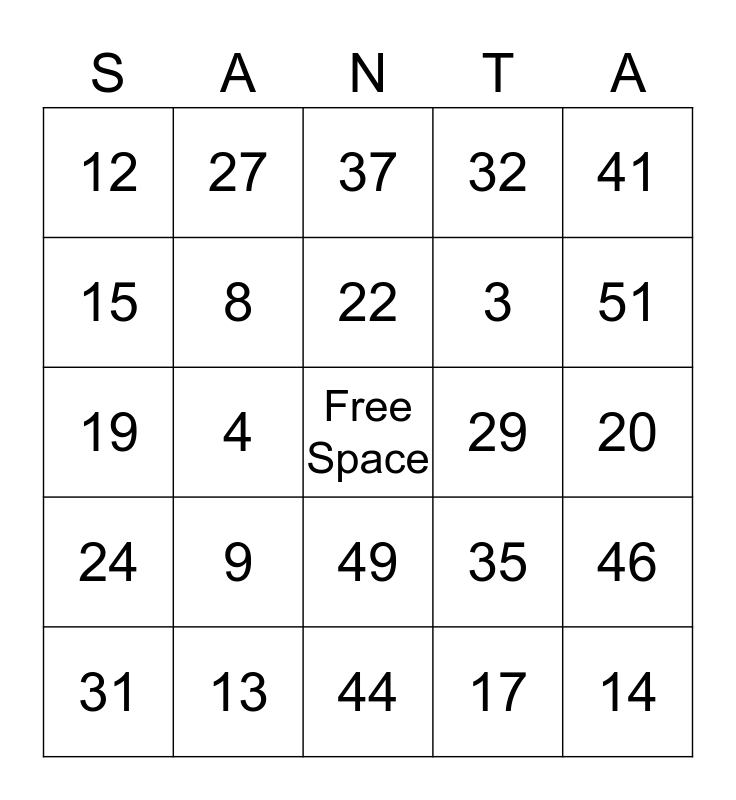 This bingo card has a free space and 24 words: 9, 13, 22, 31, 41, 12, 15, 27, 29, 49, 3, 19, 35, 46, 8, 17, 20, 37, 51, 4, 14, 24, 32 and 44.