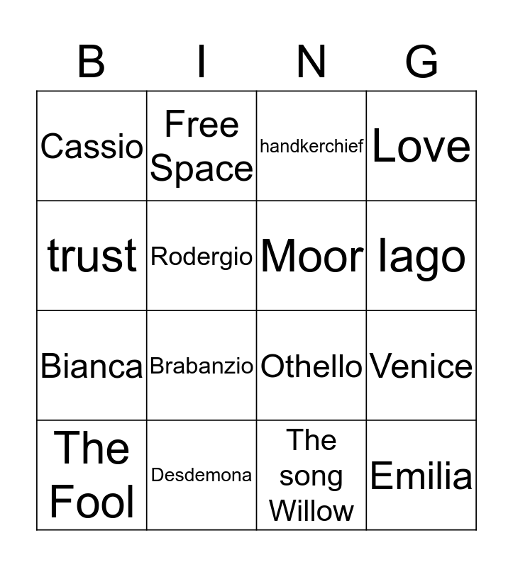 This bingo card has 16 words: Desdemona, Venice, handkerchief, Cassio, Bianca, Free Space, Othello, The song Willow, trust, Rodergio, The Fool, Love, Brabanzio, Iago, Moor and Emilia.