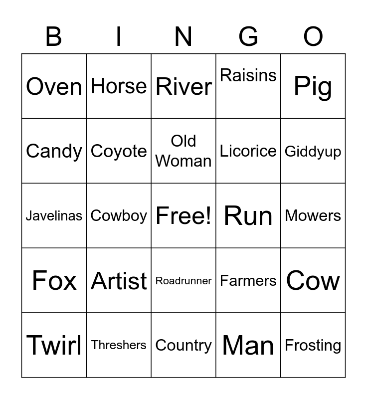 This bingo card has a free space and 32 words: Man, Boy, Cowboy, Girl, Fox, Coyote, Pig, Cow, Horse, Old Man, Old Woman, River, Tail, Snout, Run, Leap, Twirl, Javelinas, Roadrunner, Artist, Farmers, Dog Walkers, Mowers, Threshers, Frosting, Raisins, Licorice, Candy, Oven, Country, Wild, wild West and Giddyup.