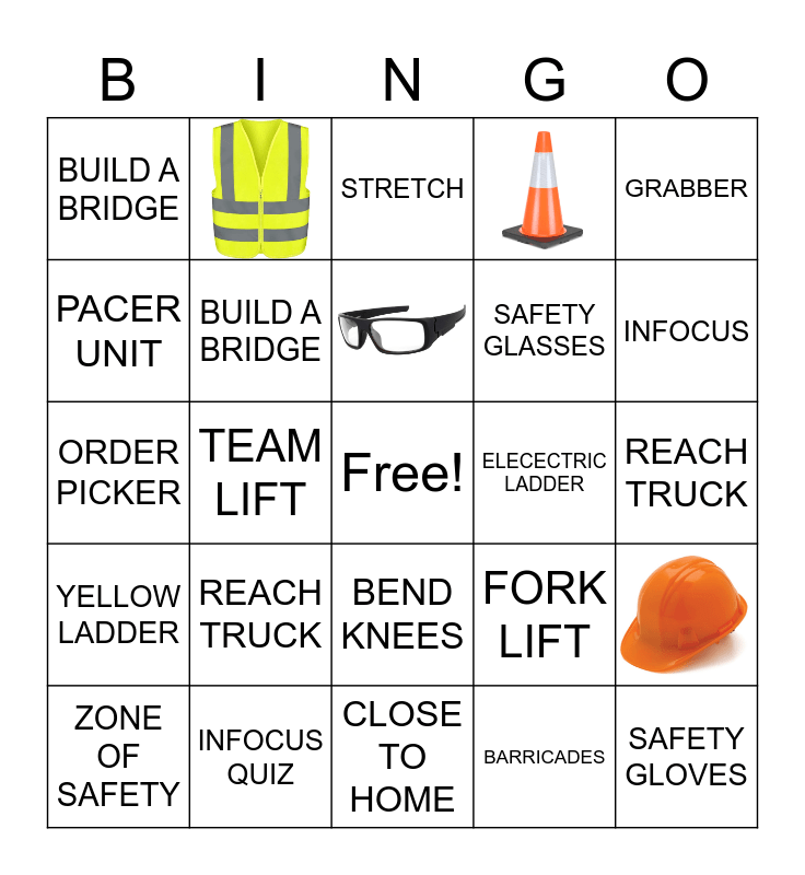 This bingo card has 5 images, a free space and 24 words: ZONE OF SAFETY, ORANGE LADDER, TEAM LIFT, KAVLAR GLOVES, BUILD A BRIDGE, STRETCH, BUILD A BRIDGE, REACH TRUCK, ELECECTRIC LADDER, INFOCUS QUIZ, REACH TRUCK, SAFETY GLOVES, CLOSE TO HOME, BARRICADES, INFOCUS, FORM UP, BEND KNEES, YELLOW LADDER, GRABBER, ORDER PICKER, FORK LIFT, GEAR UP, SAFETY GLASSES and PACER UNIT.
