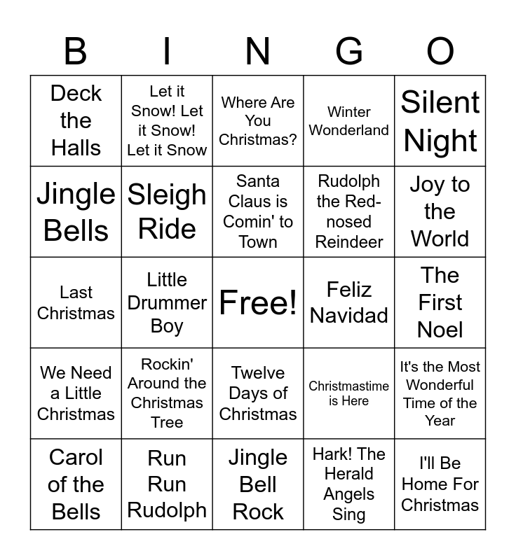 This bingo card has a free space and 49 words: White Christmas, I'll Be Home For Christmas, Have Yourself a Merry Little Christmas, Jingle Bell Rock, Rockin' Around the Christmas Tree, Frosty the Snowman, Let it Snow! Let it Snow! Let it Snow, Mele Kelikimaka, Jingle Bells, Blue Christmas, Sleigh Ride, Winter Wonderland, It's the Most Wonderful Time of the Year, Christmastime is Here, A Holly Jolly Christmas, Do You Hear What I Hear?, Santa Claus is Comin' to Town, Feliz Navidad, I Saw Mommy Kissing Santa Claus, Silent Night, Little Drummer Boy, Hark! The Herald Angels Sing, Deck the Halls, Rudolph the Red-nosed Reindeer, O Holy Night, Joy to the World, Carol of the Bells, Oh Come All Ye Faithful, Twelve Days of Christmas, We Need a Little Christmas, It's Beginning to Look a Lot Like Christmas, Mary, Did You Know?, White Christmas, The Christmas Song, Run Run Rudolph, Believe, You're a Mean One Mr Grinch, Silver Bells, The First Noel, O' Tannenbaum, Noche De Paz, I Want a Hippopotamus For Christmas, The Chipmunk Song (Christmas Don't Be Late), All I Want For Christmas Is You, Last Christmas, Where Are You Christmas?, All I Want For Christmas Is My Two Front Teeth, Light of the World and Grandma Got Runover By a Reindeer.