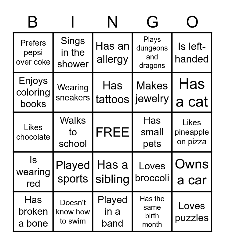 This bingo card has a free space and 32 words: Has the same birth month, Likes Disney*, Walks to school, Travelled abroad this year, Is wearing red, Wearing sneakers, Is left-handed, Owns a car, Sings in the shower, Knows how to skateboard, Has tattoos, Has an allergy, Can whistle (well), Has a pet dog, Has small pets, Bought new furniture, Has broken a bone, Likes chocolate, Has a sibling, Played sports, Loves broccoli, Writes poetry, Likes pineapple on pizza, Doesn't know how to swim, Loves puzzles, Plays dungeons and dragons, Makes jewelry, Enjoys coloring books, Prefers pepsi over coke, Played in a band, Likes to surf and Has a cat.