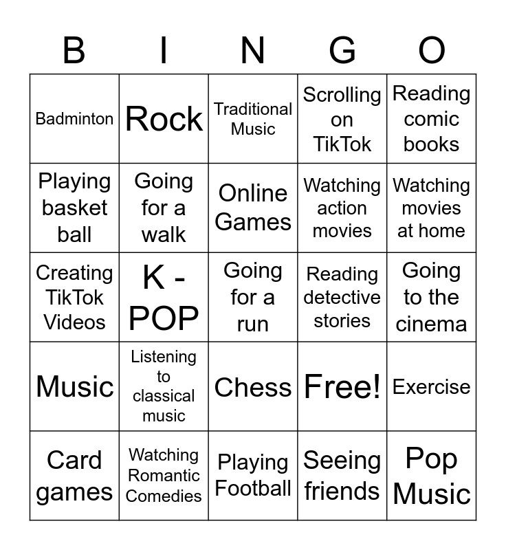 This bingo card has 27 words: Free!, Pop Music, Watching action movies, Playing Football, Playing basket ball, Traditional Music, Rock, Music, Reading detective stories, Exercise, Creating TikTok Videos, Scrolling on TikTok, Card games, Watching Romantic Comedies, Watching movies at home, Watching K Dramas, Going for a walk, Online Games, Listening to classical music, Badminton, Going to the cinema, Seeing friends, K - POP, Going for a run, Chess, Reading comic books and PlayStation.