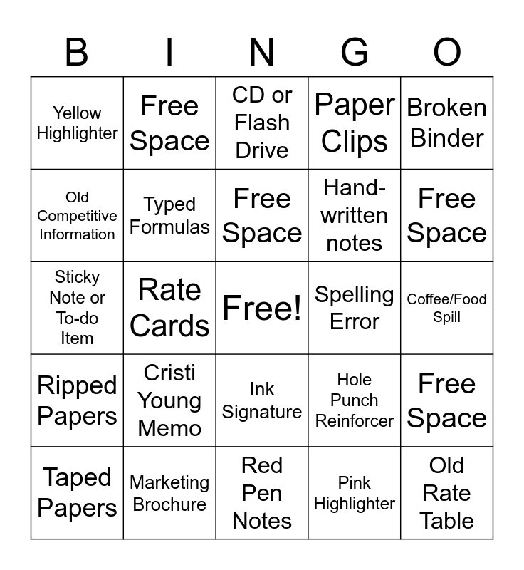 This bingo card has a free space and 24 words: Cristi Young Memo, Marketing Brochure, Free Space, Taped Papers, Broken Binder, Yellow Highlighter, Old Competitive Information, Free Space, Spelling Error, Ink Signature, Hand-written notes, Sticky Note or To-do Item, Hole Punch Reinforcer, Free Space, Typed Formulas, Pink Highlighter, Coffee/Food Spill, CD or Flash Drive, Free Space, Rate Cards, Old Rate Table, Ripped Papers, Paper Clips and Red Pen Notes.
