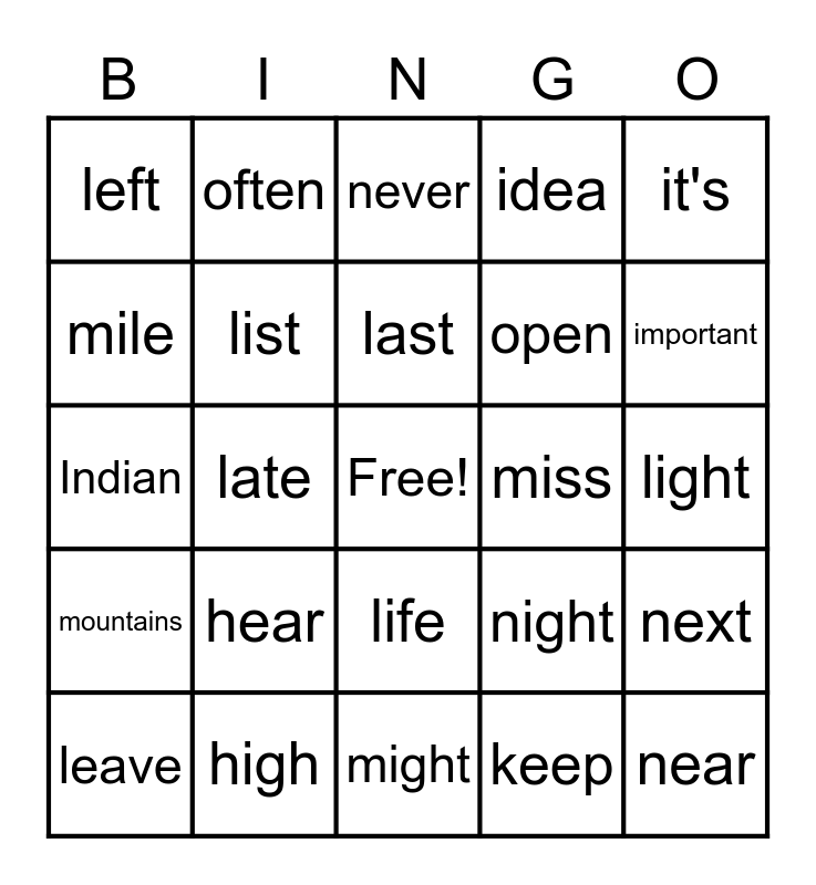 This bingo card has a free space and 24 words: hear, high, last, leave, it's, left, mile, often, miss, life, open, Indian, night, next, list, keep, light, never, important, late, near, mountains, idea and might.