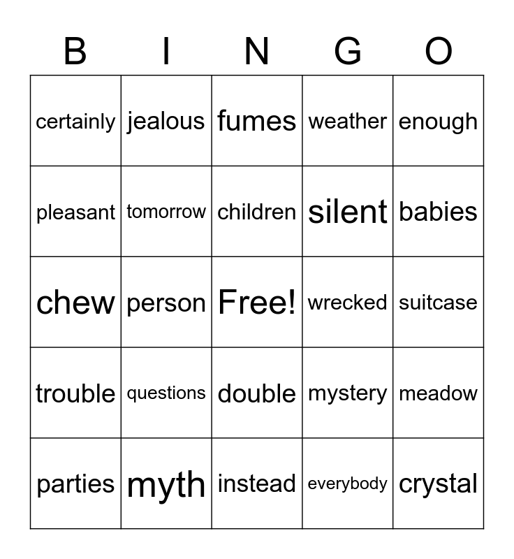 This bingo card has a free space and 49 words: remember, crystal, voice, instead, questions, someone, jealous, anything, pleasant, announce, tomorrow, weather, meadow, mystery, probably, woman, children, wrecked, publish, enough, person, everybody, certainly, silent, overhead, babies, parties, cities, double, trouble, breathe, measure, heaven, treasure, myth, launched, hauled, laundry, suitcase, fruits, choose, rescue, value, duty, chew, fumes, through, pupil and weigh.