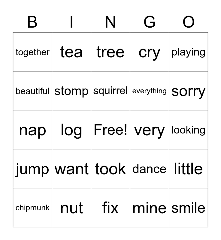 This bingo card has a free space and 24 words: want, nut, squirrel, chipmunk, playing, together, beautiful, tea, very, took, everything, nap, dance, little, stomp, mine, looking, tree, sorry, log, smile, jump, cry and fix.