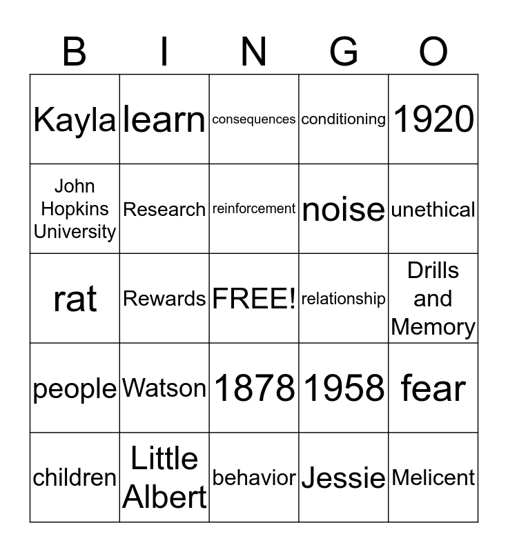 This bingo card has a free space and 24 words: Watson, Little Albert, reinforcement, children, 1920, Kayla, John Hopkins University, learn, relationship, 1878, noise, rat, 1958, fear, Research, Jessie, Drills and Memory, consequences, unethical, Rewards, Melicent, people, conditioning and behavior.
