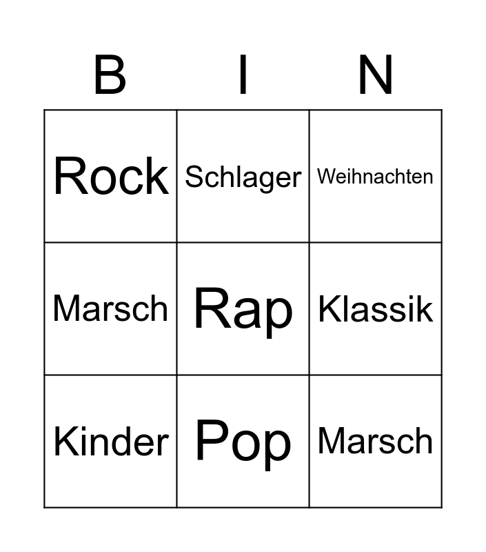 This bingo card has a free space and 8 words: Marsch, Schlager, Klassik, Kinder, Weihnachten, Rock, Pop and Marsch.