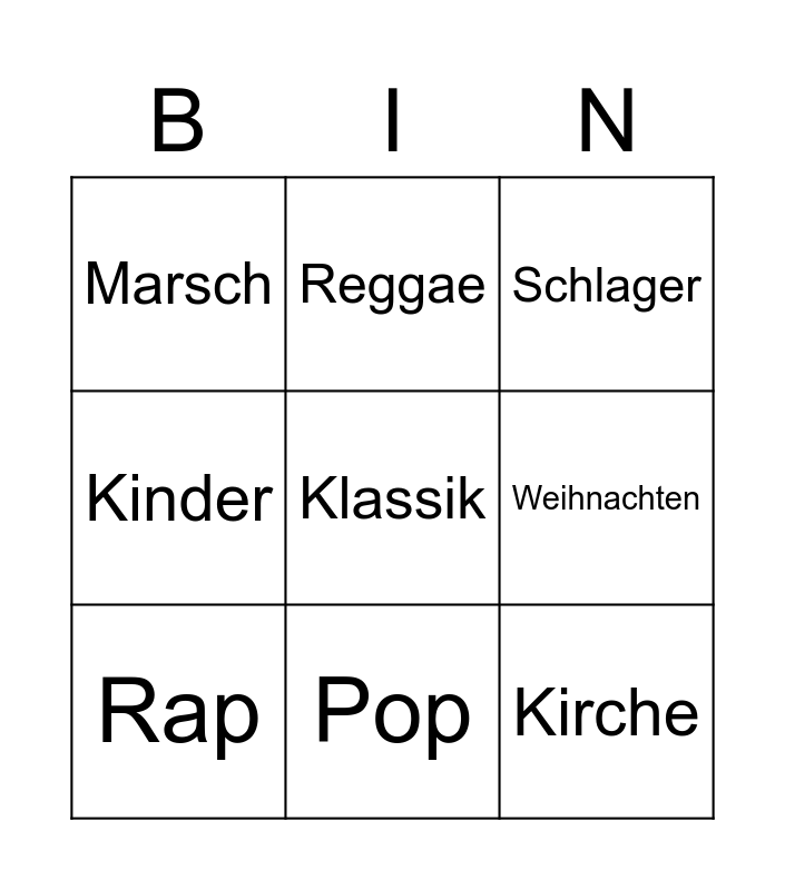 This bingo card has 9 words: Rap, Klassik, Schlager, Marsch, Reggae, Weihnachten, Kinder, Pop and Kirche.