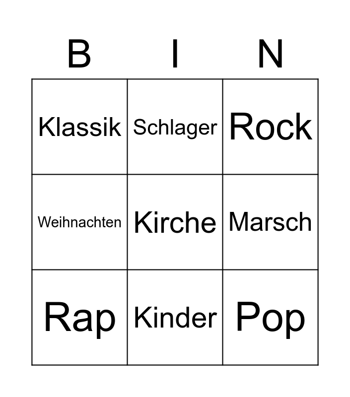This bingo card has 9 words: Rap, Kirche, Rock, Klassik, Schlager, Marsch, Weihnachten, Kinder and Pop.