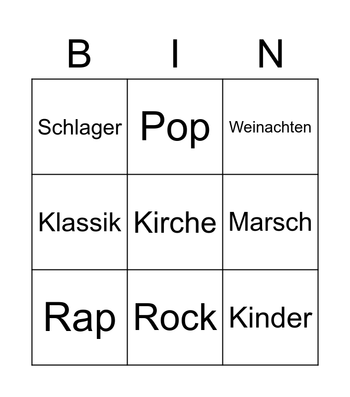This bingo card has 9 words: Rap, Kirche, Weinachten, Schlager, Pop, Marsch, Klassik, Rock and Kinder.