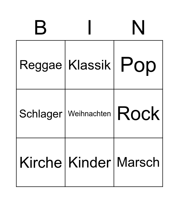 This bingo card has 9 words: Kirche, Weihnachten, Pop, Reggae, Klassik, Rock, Schlager, Kinder and Marsch.