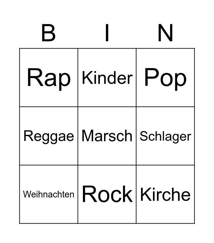 This bingo card has 9 words: Weihnachten, Marsch, Pop, Rap, Kinder, Schlager, Reggae, Rock and Kirche.
