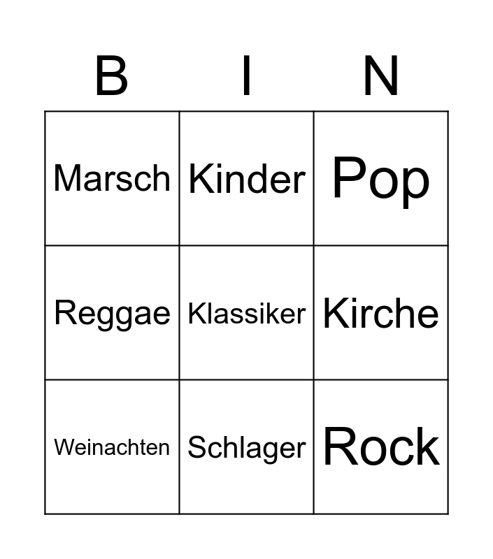 This bingo card has 9 words: Weinachten, Klassiker, Pop, Marsch, Kinder, Kirche, Reggae, Schlager and Rock.