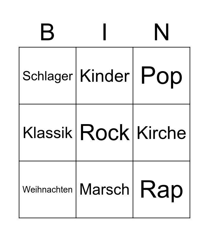 This bingo card has 9 words: Weihnachten, Rock, Pop, Schlager, Kinder, Kirche, Klassik, Marsch and Rap.