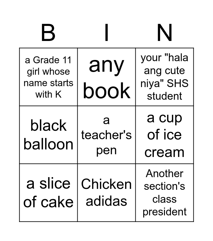 This bingo card has 9 words: a slice of cake, your "hala ang cute niya" SHS student, any book, black balloon, a Grade 11 girl whose name starts with K, a cup of ice cream, a teacher's pen, Another section's class president and Chicken adidas.
