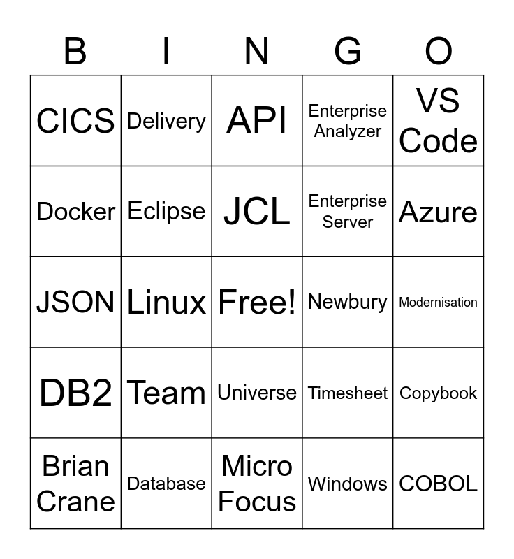 This bingo card has a free space and 47 words: Mainframe, COBOL, AWS, Micro Focus, Team, Presales, Delivery, AMC, Docker, Visual Studio, Eclipse, Enterprise Analyzer, Copybook, Timesheet, Virtual Machine, Cloud, JCL, Newbury, Enterprise Developer, VS Code, Linux, Windows, CICS, Enterprise Server, ESCWA, Azure, Brian Crane, Dev Day, Universe, DB2, SQL Server, Testing, Performance, Batch processing, Graduates, Database, Modernisation, Host Connectivity, 3270, Rapid Assessment, Data Migration, API, JSON, BANKDEMO, Red Hat, License and Assembler.