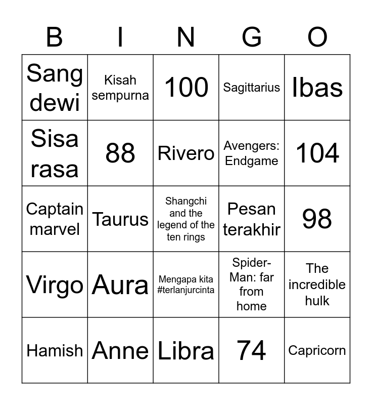 This bingo card has a free space and 24 words: Aura, Anne, Rivero, Hamish, Ibas, Sang dewi, Sisa rasa, Kisah sempurna, Pesan terakhir, Mengapa kita #terlanjurcinta, Avengers: Endgame, Captain marvel, Spider-Man: far from home, The incredible hulk, 88, 74, 98, 100, 104, Taurus, Capricorn, Virgo, Sagittarius and Libra.