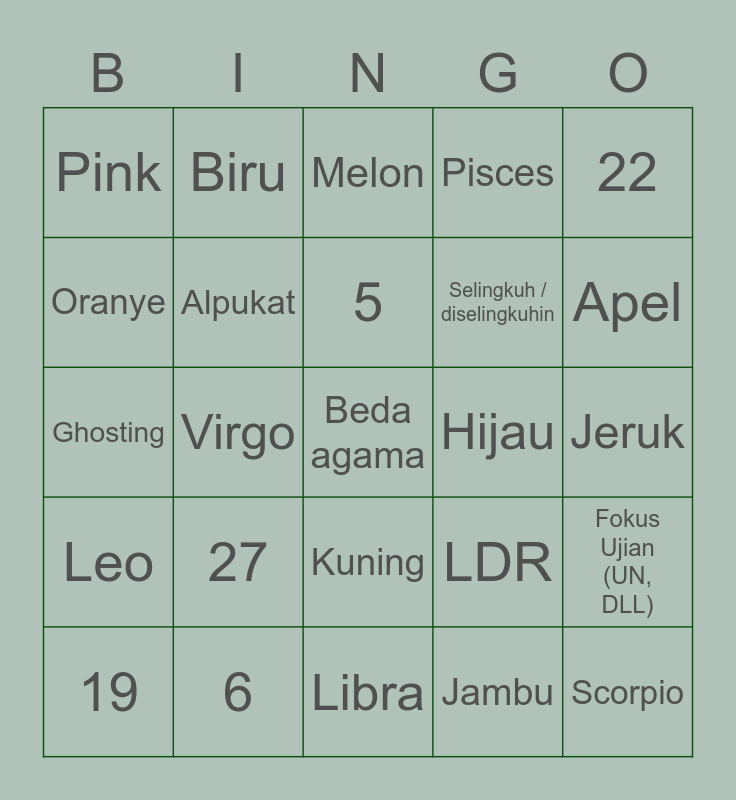 This bingo card has a free space and 24 words: 27, 6, 5, 19, 22, Pink, Oranye, Biru, Hijau, Kuning, Selingkuh / diselingkuhin, Ghosting, LDR, Fokus Ujian (UN, DLL), Alpukat, Jambu, Jeruk, Melon, Apel, Virgo, Scorpio, Leo, Pisces and Libra.