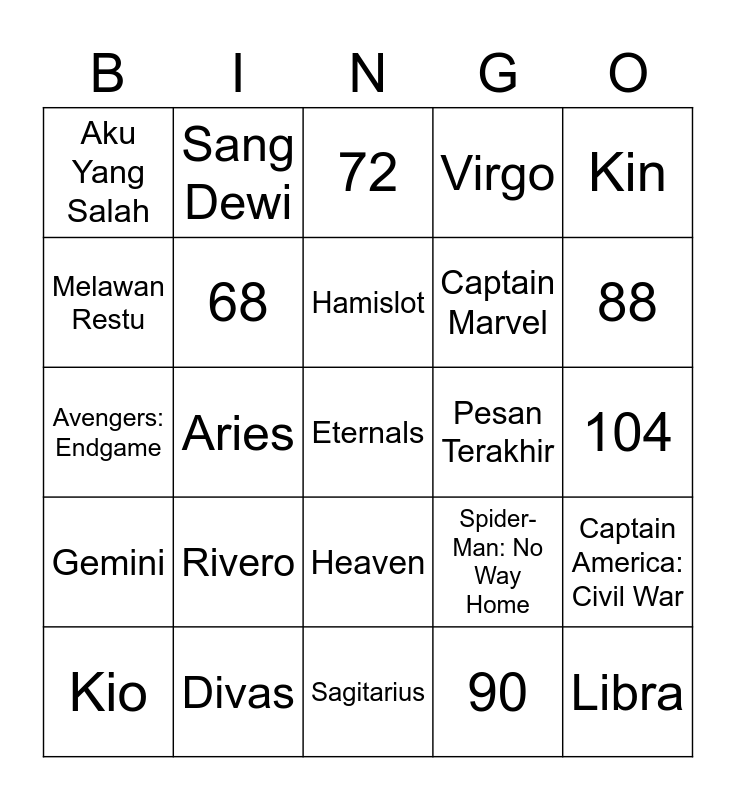 This bingo card has a free space and 24 words: Rivero, Divas, Hamislot, Kio, Kin, Aku Yang Salah, Melawan Restu, Sang Dewi, Pesan Terakhir, Heaven, Captain Marvel, Avengers: Endgame, Spider-Man: No Way Home, Captain America: Civil War, 68, 90, 104, 72, 88, Aries, Libra, Gemini, Virgo and Sagitarius.