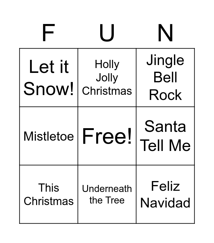 This bingo card has a free space and 8 words: Santa Tell Me, Jingle Bell Rock, Holly Jolly Christmas, This Christmas, Let it Snow!, Feliz Navidad, Mistletoe and Underneath the Tree.