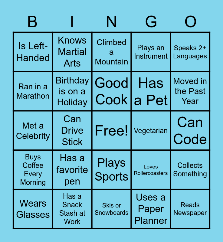 This bingo card has a free space and 25 words: Has a favorite pen, Skis or Snowboards, Good Cook, Wears Glasses, Speaks 2+ Languages, Is Left-Handed, Ran in a Marathon, Knows Martial Arts, Vegetarian, Plays Sports, Has a Pet, Met a Celebrity, Loves Rollercoasters, Collects Something, Birthday is on a Holiday, Visited 4+ Continents, Can Code, Climbed a Mountain, Moved in the Past Year, Can Drive Stick, Reads Newspaper, Has a Snack Stash at Work, Buys Coffee Every Morning, Plays an Instrument and Uses a Paper Planner.
