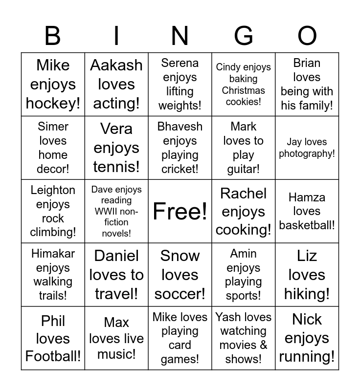 This bingo card has a free space and 24 words: Daniel loves to travel!, Max loves live music!, Bhavesh enjoys playing cricket!, Phil loves Football!, Brian loves being with his family!, Mike enjoys hockey!, Simer loves home decor!, Aakash loves acting!, Rachel enjoys cooking!, Snow loves soccer!, Mark loves to play guitar!, Leighton enjoys rock climbing!, Amin enjoys playing sports!, Liz loves hiking!, Vera enjoys tennis!, Yash loves watching movies & shows!, Hamza loves basketball!, Serena enjoys lifting weights!, Jay loves photography!, Dave enjoys reading WWII non-fiction novels!, Nick enjoys running!, Himakar enjoys walking trails!, Cindy enjoys baking Christmas cookies! and Mike loves playing card games!.