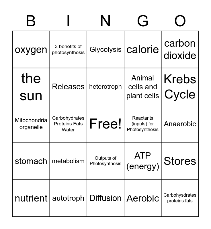 This bingo card has a free space and 24 words: metabolism, autotroph, heterotroph, nutrient, carbon dioxide, oxygen, the sun, 3 benefits of photosynthesis, Reactants (inputs) for Photosynthesis, Outputs of Photosynthesis, Animal cells and plant cells, Mitochondria organelle, ATP (energy), Stores, Releases, Aerobic, Anaerobic, Glycolysis, Krebs Cycle, Carbohydrates Proteins Fats Water, Carbohysdrates proteins fats, stomach, calorie and Diffusion.