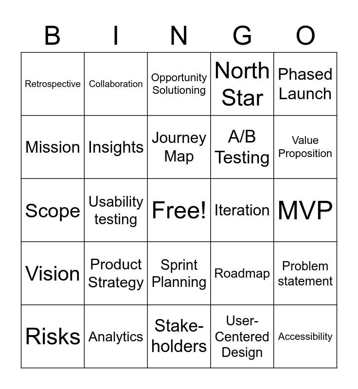 This bingo card has a free space and 24 words: Product Strategy, Analytics, Journey Map, Risks, Phased Launch, Retrospective, Mission, Collaboration, Iteration, Sprint Planning, A/B Testing, Scope, Roadmap, Problem statement, Insights, User-Centered Design, MVP, Opportunity Solutioning, Value Proposition, Usability testing, Accessibility, Vision, North Star and Stake- holders.