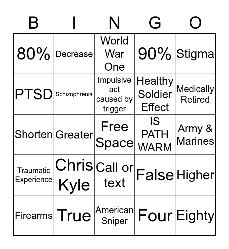 This bingo card has a free space and 24 words: Chris Kyle, True, Impulsive act caused by trigger, Firearms, Stigma, 80%, PTSD, Decrease, IS PATH WARM, Call or text, Healthy Soldier Effect, Shorten, False, Higher, Schizophrenia, Four, Army & Marines, World War One, Medically Retired, Greater, Eighty, Traumatic Experience, 90% and American Sniper.