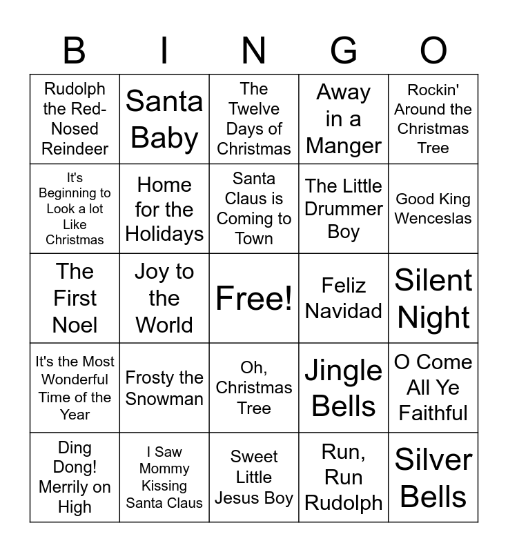 This bingo card has a free space and 68 words: Let it Snow! Let it Snow! Let it Snow!, Silver Bells, Have Yourself a Merry Little Christmas, Here Comes Santa Claus, Do You Hear What I Hear?, Last Christmas, Santa Baby, Winter Wonderland, Santa Claus is Coming to Town, White Christmas, Oh, Christmas Tree, Deck the Halls, Silent Night, Rockin' Around the Christmas Tree, A Holly Jolly Christmas, It's Beginning to Look a lot Like Christmas, Joy to the World, Rudolph the Red-Nosed Reindeer, I'll Be Home for Christmas, Frosty the Snowman, The Little Drummer Boy, Jingle Bells, It's the Most Wonderful Time of the Year, We Wish You a Merry Christmas, I Saw Three Ships, Hark! The Herald Angels Sing, O Holy Night, Go Tell It On The Mountain, O Come All Ye Faithful, We Three Kings, The Twelve Days of Christmas, Angels We Have Heard on High, O Come, O Come Emmanuel, O Little Town of Bethlehem, Away in a Manger, The Holly and the Ivy, Carol of the Bells, Ding Dong! Merrily on High, Good King Wenceslas, The First Noel, The Christmas Song (Chestnuts Roasting on an Open Fire), All I Want For Christmas, Home for the Holidays, What Child is This?, Mary’s Boy Child, It Came Upon a Midnight Clear, Carol of the Bells, A Cradle in Bethlehem, Feliz Navidad, I Saw Mommy Kissing Santa Claus, Blue Christmas, Christmas (Baby Please Come Home), I Heard the Bells on Christmas Day, Sweet Little Jesus Boy, Jingle Bell Rock, Mele Kelikimaka, Run, Run Rudolph, Christmas Don’t Be Late, Christmas Time is Here, Wonderful Christmastime, Believe, We Need A Little Christmas, Mary, Did You Know, Do They Know It’s Christmas?, Up On the Housetop, You’re a Mean One Mr. Grinch, Ave Maria and Jingle, Jingle, Jingle!.
