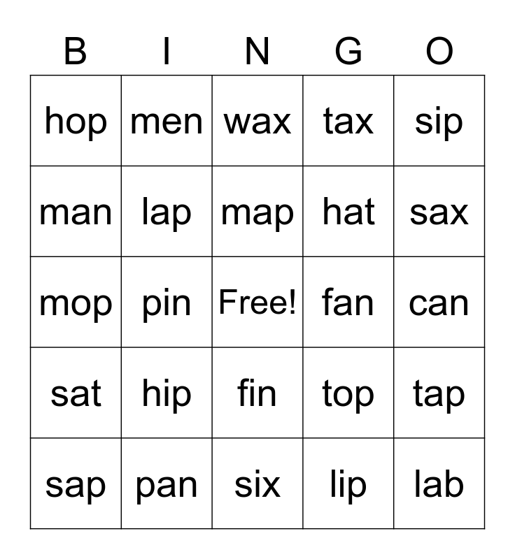 This bingo card has a free space and 24 words: hip, pan, map, sap, sip, hop, man, men, fan, fin, hat, mop, top, tap, lap, lip, can, wax, sax, pin, lab, sat, tax and six.