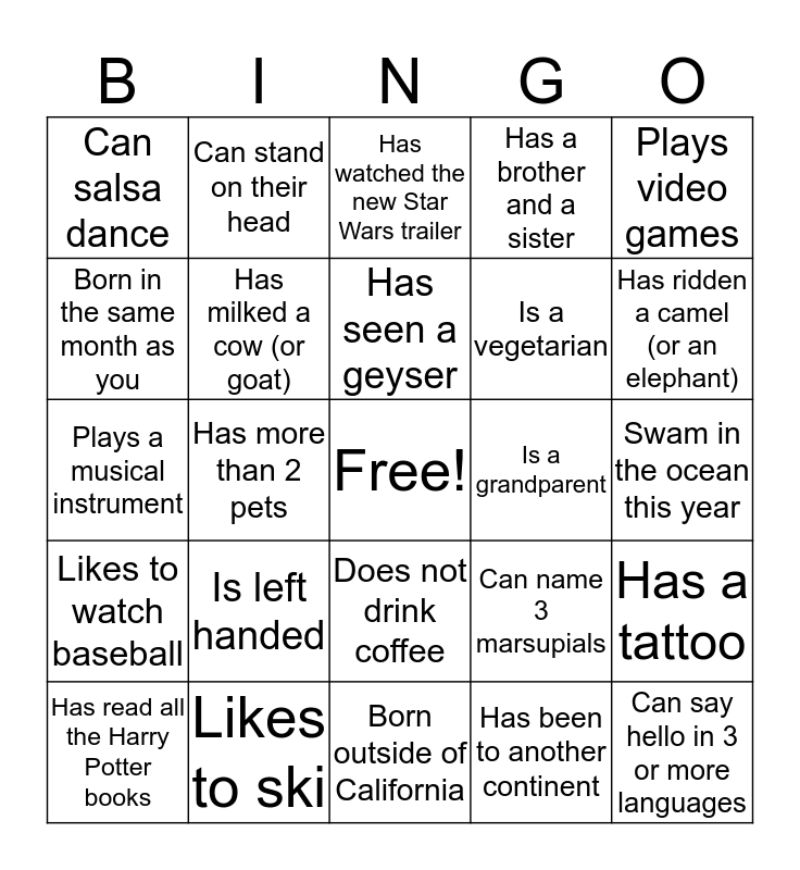 This bingo card has a free space and 24 words: Is left handed, Likes to ski, Has seen a geyser, Has read all the Harry Potter books, Plays video games, Can salsa dance, Born in the same month as you, Can stand on their head, Is a grandparent, Does not drink coffee, Is a vegetarian, Plays a musical instrument, Can name 3 marsupials, Has a tattoo, Has milked a cow (or goat), Has been to another continent, Swam in the ocean this year, Has watched the new Star Wars trailer, Has ridden a camel (or an elephant), Has more than 2 pets, Can say hello in 3 or more languages, Likes to watch baseball, Has a brother and a sister and Born outside of California.