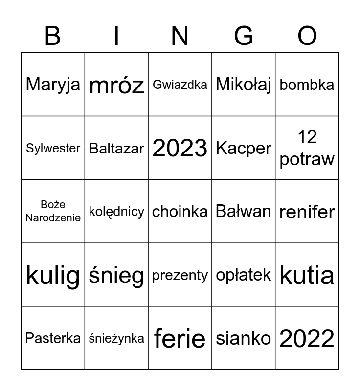 This bingo card has 43 words: Free!, choinka, Wigilia, Pasterka, karp, sianko, Gwiazdka, kolęda, bombka, śnieżynka, Mikołaj, Bałwan, prezenty, śnieg, mróz, ferie, pastorałka, Boże Narodzenie, Nowy Rok, 12 potraw, mróz, Gwiazda Betlejemska, Jezus, Maryja, Józef, renifer, Cicha Noc, Pastuszkowie, opłatek, kulig, Szopka, kutia, rodzina, kolędnicy, winszowanie, grudzień, 2022, 2023, Sylwester, Kacper, Melchior, Baltazar and Święta.