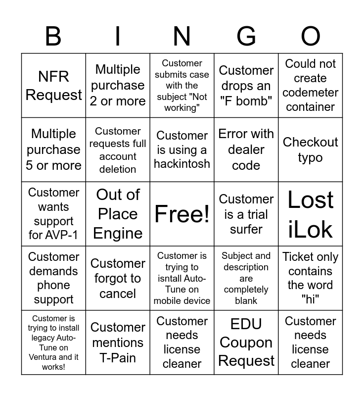 This bingo card has a free space and 52 words: Customer needs a WIBU refresh, Customer needs license cleaner, Customer needs a WIBU refresh, Customer needs license cleaner, Customer forgot to cancel, Customer has more than 3 concurrent subscriptions, Multiple purchase 2 or more, Multiple purchase 3 or more, Multiple purchase 5 or more, "My kid used my credit card", Customer requests full account deletion, Customer writes "Autotunes", Ticket only contains the word "hi", Subject and description are completely blank, Customer submits 5 or more tickets in one day, Customer is using Windows 7, Customer is using a hackintosh, Customer is a trial surfer, Error 500, Could not create codemeter container, Out of Place Engine, EDU Coupon Request, NFR Request, Error with dealer code, Customer mentions their social media following in a case, Customer requests a supervisor, Customer threatens legal action against Antares, Customer uses excuse to request free stuff, Checkout typo, Customer can't get password reset link, Customer swears they cancelled within the trial period, Customer drops an "F bomb", Customer provides invoice from "Ding Dong!", Customer does something you've never seen before, Customer will not follow directions, Customer submits case with the subject "Not working", Customer mentions T-Pain, Customer submits an audio sample, Customer is using Audactiy, Customer is using Reason, Customer asks about VST2 support, Lost iLok, Customer demands phone support, Customer requests remote session, Customer is trying to isntall Auto-Tune on mobile device, Customer wants to buy an older version of Auto-Tune, Customer submits a ticket about legacy SoundSoap/BIAS/Peak software, Customer wants support for AVP-1, Customer is trying to use iLok to authorize modern plugin, Customer is trying to install legacy Auto-Tune on Ventura and it doesn't work, Customer is trying to install legacy Auto-Tune on Ventura and it works! and Customer complains about subscription model.