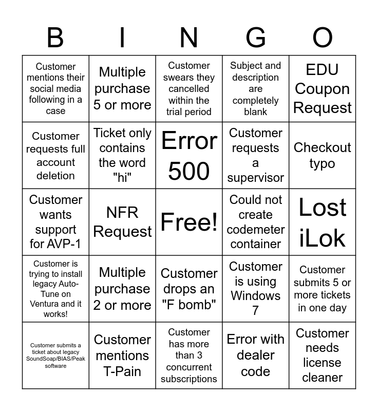 This bingo card has a free space and 50 words: Customer needs a WIBU refresh, Customer needs license cleaner, Customer forgot to cancel, Customer has more than 3 concurrent subscriptions, Multiple purchase 2 or more, Multiple purchase 3 or more, Multiple purchase 5 or more, "My kid used my credit card", Customer requests full account deletion, Customer writes "Autotunes", Ticket only contains the word "hi", Subject and description are completely blank, Customer submits 5 or more tickets in one day, Customer is using Windows 7, Customer is using a hackintosh, Customer is a trial surfer, Error 500, Could not create codemeter container, Out of Place Engine, EDU Coupon Request, NFR Request, Error with dealer code, Customer mentions their social media following in a case, Customer requests a supervisor, Customer threatens legal action against Antares, Customer uses excuse to request free stuff, Checkout typo, Customer can't get password reset link, Customer swears they cancelled within the trial period, Customer drops an "F bomb", Customer provides invoice from "Ding Dong!", Customer does something you've never seen before, Customer will not follow directions, Customer submits case with the subject "Not working", Customer mentions T-Pain, Customer submits an audio sample, Customer is using Audactiy, Customer is using Reason, Customer asks about VST2 support, Lost iLok, Customer demands phone support, Customer requests remote session, Customer is trying to isntall Auto-Tune on mobile device, Customer wants to buy an older version of Auto-Tune, Customer submits a ticket about legacy SoundSoap/BIAS/Peak software, Customer wants support for AVP-1, Customer is trying to use iLok to authorize modern plugin, Customer is trying to install legacy Auto-Tune on Ventura and it doesn't work, Customer is trying to install legacy Auto-Tune on Ventura and it works! and Customer complains about subscription model.
