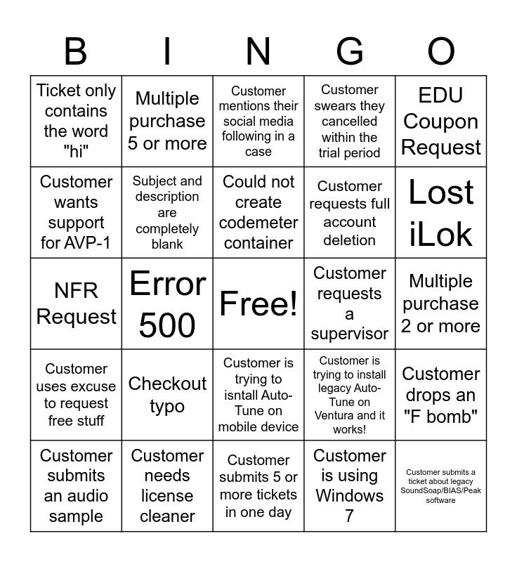 This bingo card has a free space and 50 words: Customer needs a WIBU refresh, Customer needs license cleaner, Customer forgot to cancel, Customer has more than 3 concurrent subscriptions, Multiple purchase 2 or more, Multiple purchase 3 or more, Multiple purchase 5 or more, "My kid used my credit card", Customer requests full account deletion, Customer writes "Autotunes", Ticket only contains the word "hi", Subject and description are completely blank, Customer submits 5 or more tickets in one day, Customer is using Windows 7, Customer is using a hackintosh, Customer is a trial surfer, Error 500, Could not create codemeter container, Out of Place Engine, EDU Coupon Request, NFR Request, Error with dealer code, Customer mentions their social media following in a case, Customer requests a supervisor, Customer threatens legal action against Antares, Customer uses excuse to request free stuff, Checkout typo, Customer can't get password reset link, Customer swears they cancelled within the trial period, Customer drops an "F bomb", Customer provides invoice from "Ding Dong!", Customer does something you've never seen before, Customer will not follow directions, Customer submits case with the subject "Not working", Customer mentions T-Pain, Customer submits an audio sample, Customer is using Audactiy, Customer is using Reason, Customer asks about VST2 support, Lost iLok, Customer demands phone support, Customer requests remote session, Customer is trying to isntall Auto-Tune on mobile device, Customer wants to buy an older version of Auto-Tune, Customer submits a ticket about legacy SoundSoap/BIAS/Peak software, Customer wants support for AVP-1, Customer is trying to use iLok to authorize modern plugin, Customer is trying to install legacy Auto-Tune on Ventura and it doesn't work, Customer is trying to install legacy Auto-Tune on Ventura and it works! and Customer complains about subscription model.