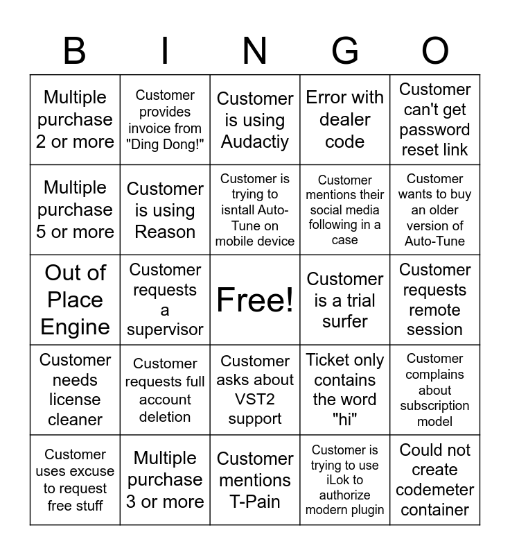 This bingo card has a free space and 50 words: Customer swears they cancelled within the trial period, Could not create codemeter container, Checkout typo, Customer mentions T-Pain, Customer requests full account deletion, Customer submits an audio sample, Customer provides invoice from "Ding Dong!", Customer is trying to install legacy Auto-Tune on Ventura and it works!, Multiple purchase 5 or more, Customer drops an "F bomb", Customer is using Reason, Error with dealer code, Customer complains about subscription model, Ticket only contains the word "hi", Customer threatens legal action against Antares, Lost iLok, Customer is trying to isntall Auto-Tune on mobile device, Customer is a trial surfer, Customer needs a WIBU refresh, Customer can't get password reset link, Customer requests a supervisor, Customer is trying to use iLok to authorize modern plugin, Multiple purchase 2 or more, Customer mentions their social media following in a case, Customer does something you've never seen before, NFR Request, Customer wants to buy an older version of Auto-Tune, Customer wants support for AVP-1, Customer is using Audactiy, Customer asks about VST2 support, Customer is using a hackintosh, Customer submits a ticket about legacy SoundSoap/BIAS/Peak software, Customer is trying to install legacy Auto-Tune on Ventura and it doesn't work, Subject and description are completely blank, Multiple purchase 3 or more, Customer writes "Autotunes", Customer submits 5 or more tickets in one day, Customer is using Windows 7, "My kid used my credit card", Customer requests remote session, Customer submits case with the subject "Not working", Error 500, Customer has more than 3 concurrent subscriptions, Customer forgot to cancel, Customer uses excuse to request free stuff, Out of Place Engine, Customer will not follow directions, Customer demands phone support, Customer needs license cleaner and EDU Coupon Request.