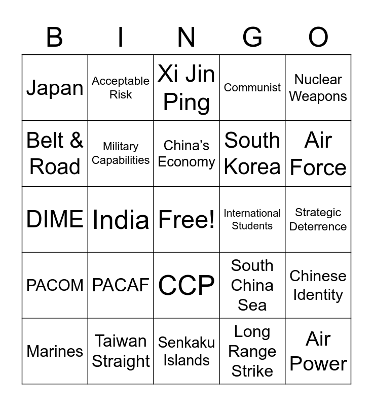 This bingo card has a free space and 64 words: International Security, Published Research, Taiwan’s Identity, Chinese Identity, Invasion of Taiwan, Great Power Competition, Acceptable Risk, Defense of Taiwan, China’s Economy, Allies and Partners, CCP, Strategic Ambiguity, Strategic Deterrence, Nuclear Weapons, Invest in Defense, Belt & Road, India, Japan, Australia, South Korea, PACAF, PACOM, Communist, Military Exercises, Joint Exercises, International Organizations, Moderator, Air War College, Air Command and Staff College (or ACSC), Place Your Comments in ATO Chat, Chinese Economy, Dominance, Army, Navy, Air Force, Marines, Institutions, Long Range Strike, Logistics, Military Capabilities, DIME, International Students, Aircraft Carrier, Global Projection, Century of Humiliation, Air Power, Taiwan Straight, East China Sea, South China Sea, Space & Cyber, Assumptions, Rising China, Senkaku Islands, PRC, Spratly Islands, Grey Zone, Xi Jin Ping, Economic Dependence, *Taiwan Compared to Ukraine, *Crowd Applause During Discussion, *Someone Drops Metal Cup, *Someone Sneezes, *Speaker Acknowledges Time and *Speaker Makes Bad Joke.