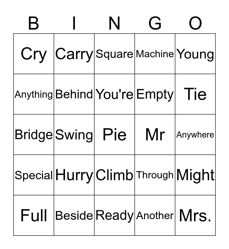 This bingo card has 25 words: Hurry, Ready, You're, Full, Young, Cry, Anything, Carry, Mr, Climb, Empty, Bridge, Through, Might, Behind, Mrs., Anywhere, Square, Tie, Swing, Pie, Beside, Special, Machine and Another.