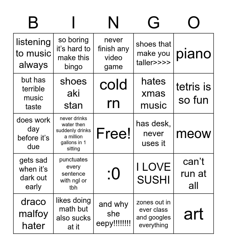 This bingo card has a free space and 24 words: punctuates every sentence with ngl or tbh, likes doing math but also sucks at it, cold rn, draco malfoy hater, piano, listening to music always, but has terrible music taste, so boring it’s hard to make this bingo, has desk, never uses it, :0, hates xmas music, does work day before it’s due, I LOVE SUSHI, can’t run at all, shoes aki stan, zones out in ever class and googles everything, meow, never finish any video game, tetris is so fun, never drinks water then suddenly drinks a million gallons in 1 sitting, art, gets sad when it’s dark out early, shoes that make you taller>>>> and and why she eepy!!!!!!!!.