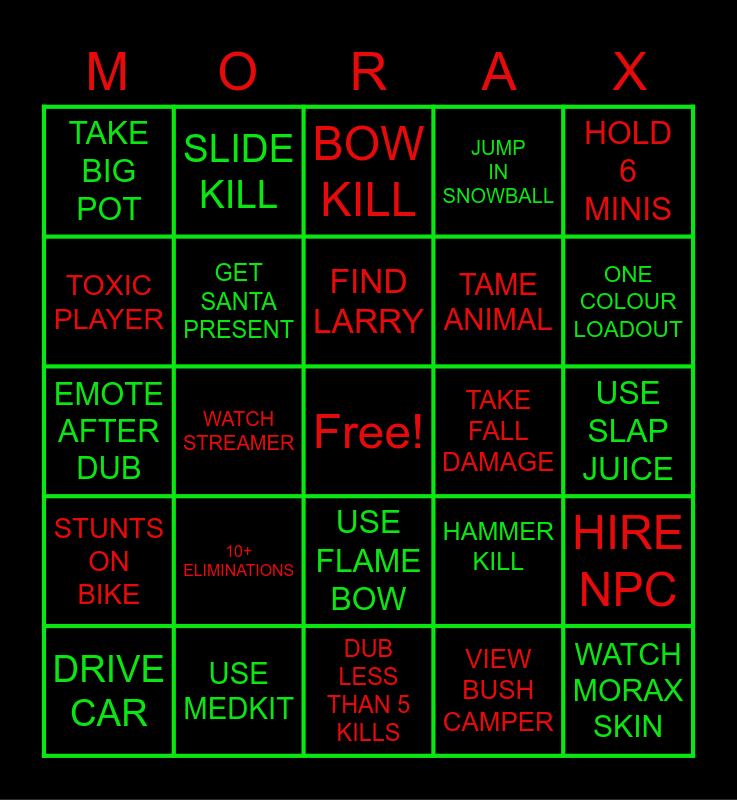 This bingo card has a free space and 24 words: 10+ ELIMINATIONS, USE MEDKIT, FIND LARRY, DRIVE CAR, HOLD 6 MINIS, TAKE BIG POT, TOXIC PLAYER, SLIDE KILL, TAKE FALL DAMAGE, USE FLAME BOW, TAME ANIMAL, EMOTE AFTER DUB, HAMMER KILL, HIRE NPC, GET SANTA PRESENT, VIEW BUSH CAMPER, USE SLAP JUICE, BOW KILL, ONE COLOUR LOADOUT, WATCH STREAMER, WATCH MORAX SKIN, STUNTS ON BIKE, JUMP IN SNOWBALL and DUB LESS THAN 5 KILLS.