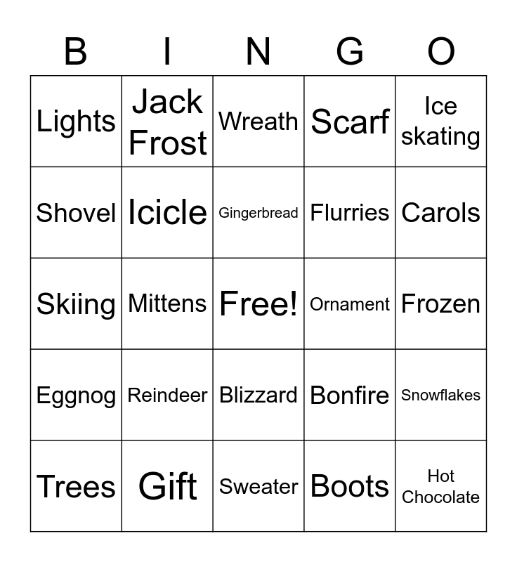 This bingo card has a free space and 29 words: Trees, Snow, Mittens, Snowman, Lights, Wreath, Icicle, Reindeer, Ornament, Gift, Frozen, Hot Chocolate, Sweater, Boots, Carols, Sledding, Blizzard, Eggnog, Ice skating, Skiing, Bonfire, Sleigh, Flurries, Shovel, Scarf, Jack Frost, Snowflakes, Gingerbread and Candy Cane.